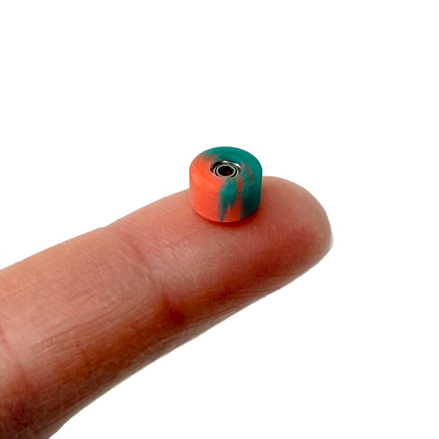 These wheels contain premium bearings with an ABEC-9 rating. These bearings are our highest quality fingerboard wheel bearings. They are extremely smooth and completely silent. These are sturdy bearings that will allow extreme movement and control. However, due to them being greased and completely shielded, they do not have the free spin our "Ultra Spin" Edition bearings do. In actual use, they are extremely responsive and have a very free roll. These wheels are designed and made in the USA using a premium quality, custom Teak blended, hard plastic material. Each wheel is casted and cut in New York. Colors are hand mixed and may vary slightly between sets.