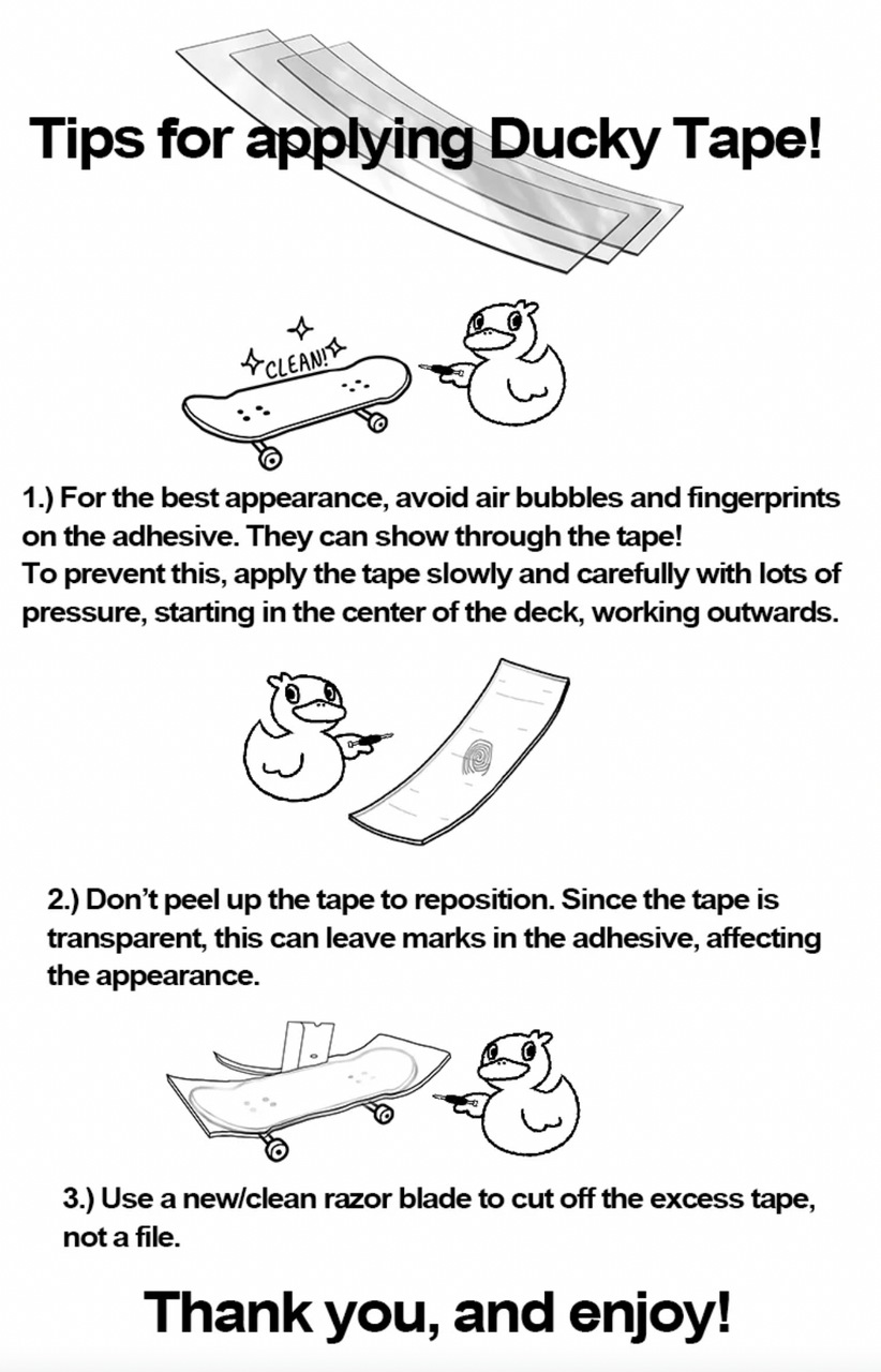 Ducky Tape is a completely transparent fingerboard grip tape. Ducky Tape is made of a rubber material that's smooth, yet insanely grippy (but not sticky!).